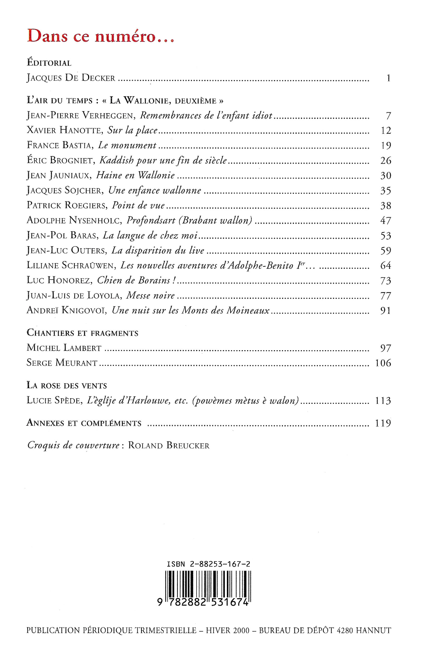 Qui l’aurait imaginé ? La Wallonie fait recette. Recette de réflexion, et d’imagination. Elle est manifestement emportée dans une dynamique de l’intelligence et de la créativité. Au niveau modeste de cette revue, cela s’est traduit par un trop-plein que nous n’avions pas encore connu. Il nous a fallu repasser les plats, jouer les prolongations. La livraison précédente n’a pas suffi à contenir tous les textes que le thème « Wallonie revue, Wallonie rêvée » avait suscités. Et lorsque l’idée a été lancée que l’on pouvait repartir pour un tour, les contributions ont recommencé à déferler.