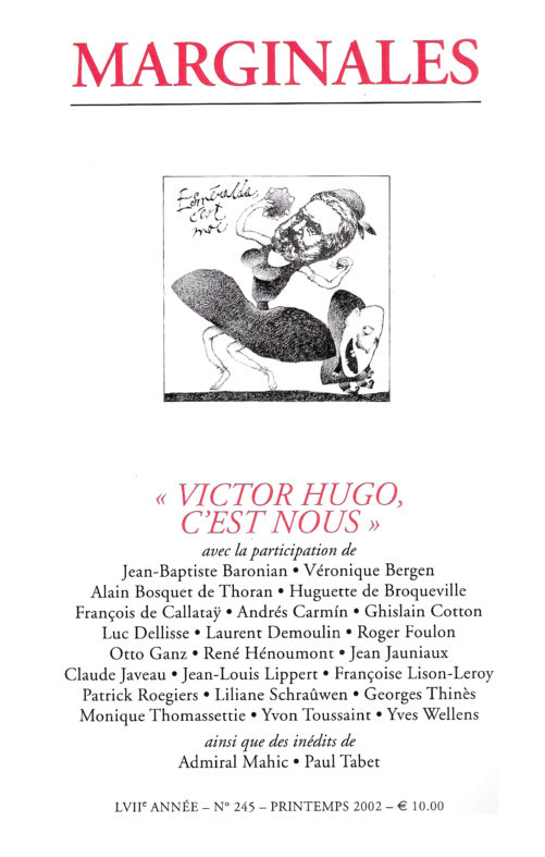 On lui rouvre la porte et il envahit tout. Le bicentenaire de Victor Hugo prend des proportions qu’aucune commémoration de ce genre n’a connue, semble-t-il. Et si l’ampleur de cette reconnaissance était à la mesure d’une singulière occultation ? Et si Hugo, en fait, avait été dissimulé dans les drapés de sa gloire ? Certes, il était le géant des lettres, le seul écrivain auquel les aliénés, notoirement, s’identifient, comme Napoléon est le politique qui peuple le plus les asiles. Il est un prototype, un archétype. L’auteur par excellence, celui par qui tous les types d’œuvre arrivent. On l’a assez dit : Hugo est un décathlonien des lettres : tout lui réussit, rien ne lui échappe. Et lorsqu’il se repose de l’écriture, il se met à dessiner, et c’est tout aussi magnifique.