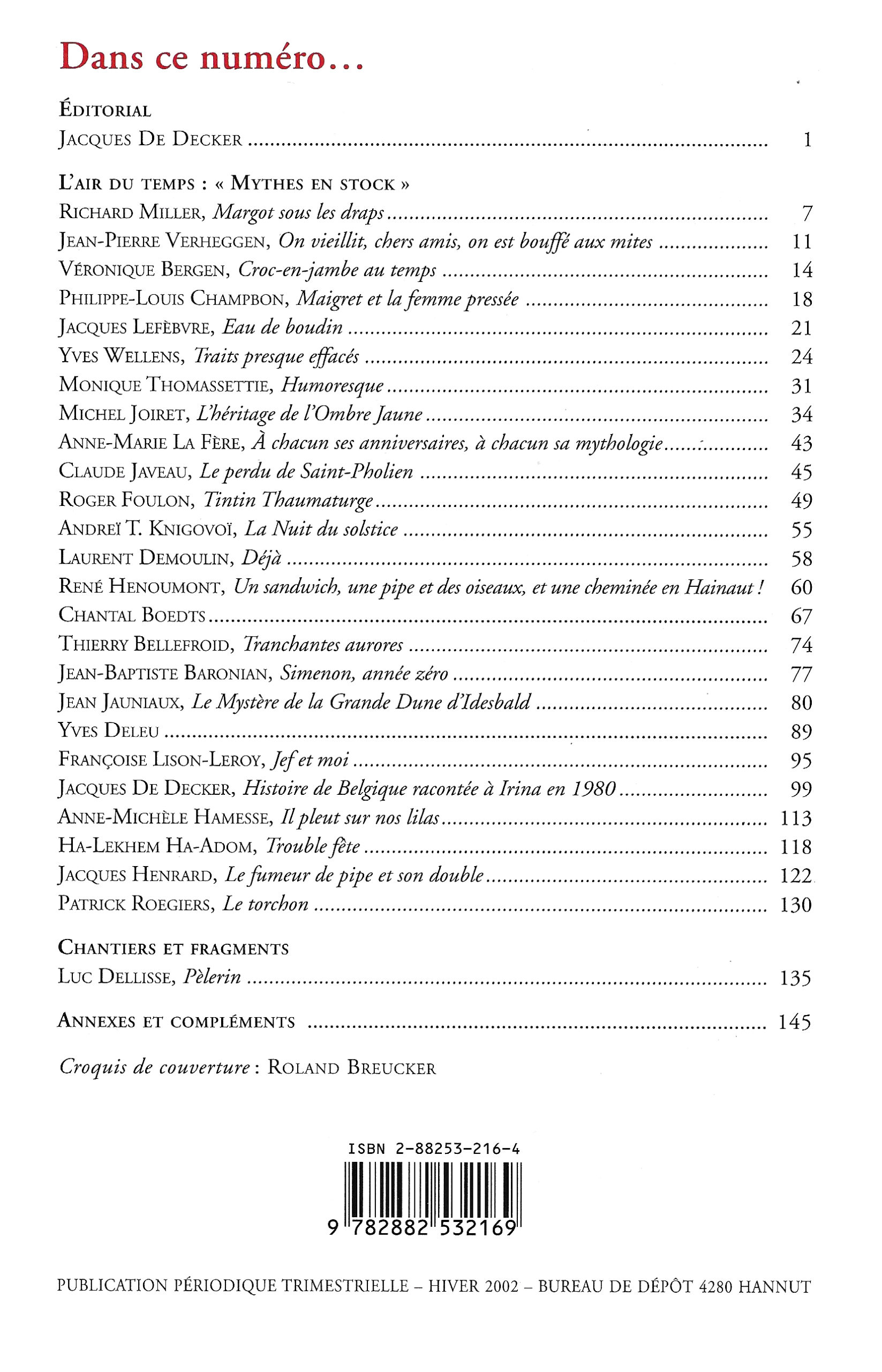 La plupart de ces créatures « made in Belgium » qui se sont mises à envahir la mémoire et même l’inconscient collectifs sont nées sur la planche à dessin de quelques artistes qui tenaient, au départ, ces activités pour secondaires parce que strictement alimentaires. Joseph Gillain, par exemple, ce géant trop méconnu de la BD belge, se considérait d’abord comme un peintre, et se désolait presque que la notoriété lui soit venue d’un volet moins noble (à ses yeux du moins) de sa créativité. Sous le nom de Jijé, il donna vie à Jerry Spring, à Blondin et Cirage, à Jean Valhardi. Quel apport insigne au huitième art ! Ses pairs le vénéraient comme un maître : ils s’appelaient Morris, Franquin, Will, et eux-mêmes furent aussi de fameux mythothètes, si l’on peut se permettre ce néologisme forgé sur le modèle du logothète cher à Roland Barthes. Lucky Luke, le Marsupilami ou Gaston Lagaffe, même Tif et Tondu sont fichés dans nos souvenirs de premières lectures, ont structuré notre vision du monde. Ils ont conquis un immense public au départ d’une rampe de lancement située rue Jules Destrée à Marcinelle. Charles Dupuis, l’éditeur qui veillait aux destinées du journal de Spirou, vient de disparaître. Il a eu droit aux hommages de Richard Miller, le ministre des Arts et des lettres et écrivain qui d’ailleurs figure au sommaire de ce numéro, et il les avait bien mérités !