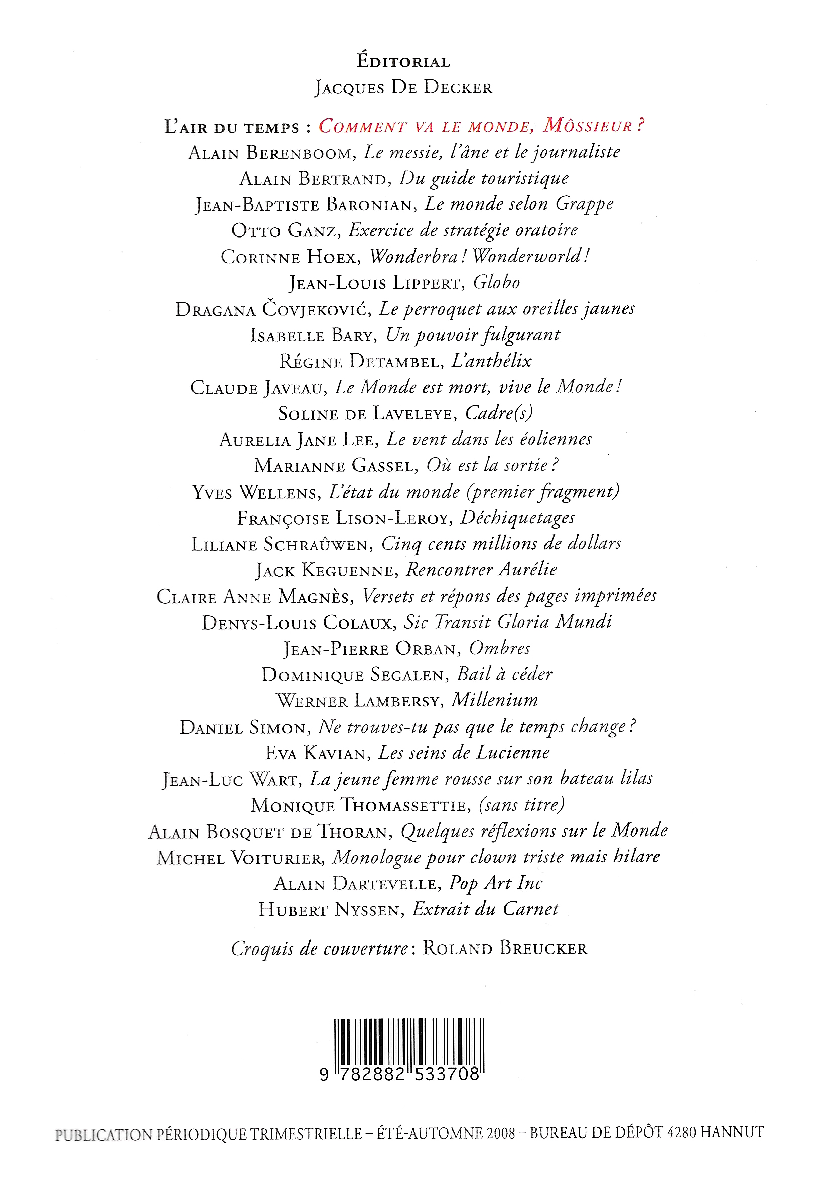Depuis, quatre fois par an, la revue s’est égaillée dans les multiples recoins de l’actualité, en vertu de la ligne qu’elle s’était donnée : laisser libre cours à la créativité littéraire. Et cela donna lieu à quelques livraisons qui ne passèrent pas inaperçues. Les thèmes culturels ne furent pas les plus nombreux. On évoqua quelques géants, Shakespeare ou Victor Hugo, Rembrandt ou Mozart, des figures majeures des arts du siècle dernier, comme Duke Ellington ou Alfred Hitchcock, on marque, usage plus original, l’anniversaire de la parution de deux livres capitaux, La psychopathologie de la vie quotidienne et Lolita. On fit quelques incursions dans le domaine sportif, à propos d’une de ces messes planétaires que sont devenues les coupes du monde du ballon rond, ou de la championne wallonne qui fut une des icônes de cette décennie, Justine Hénin.