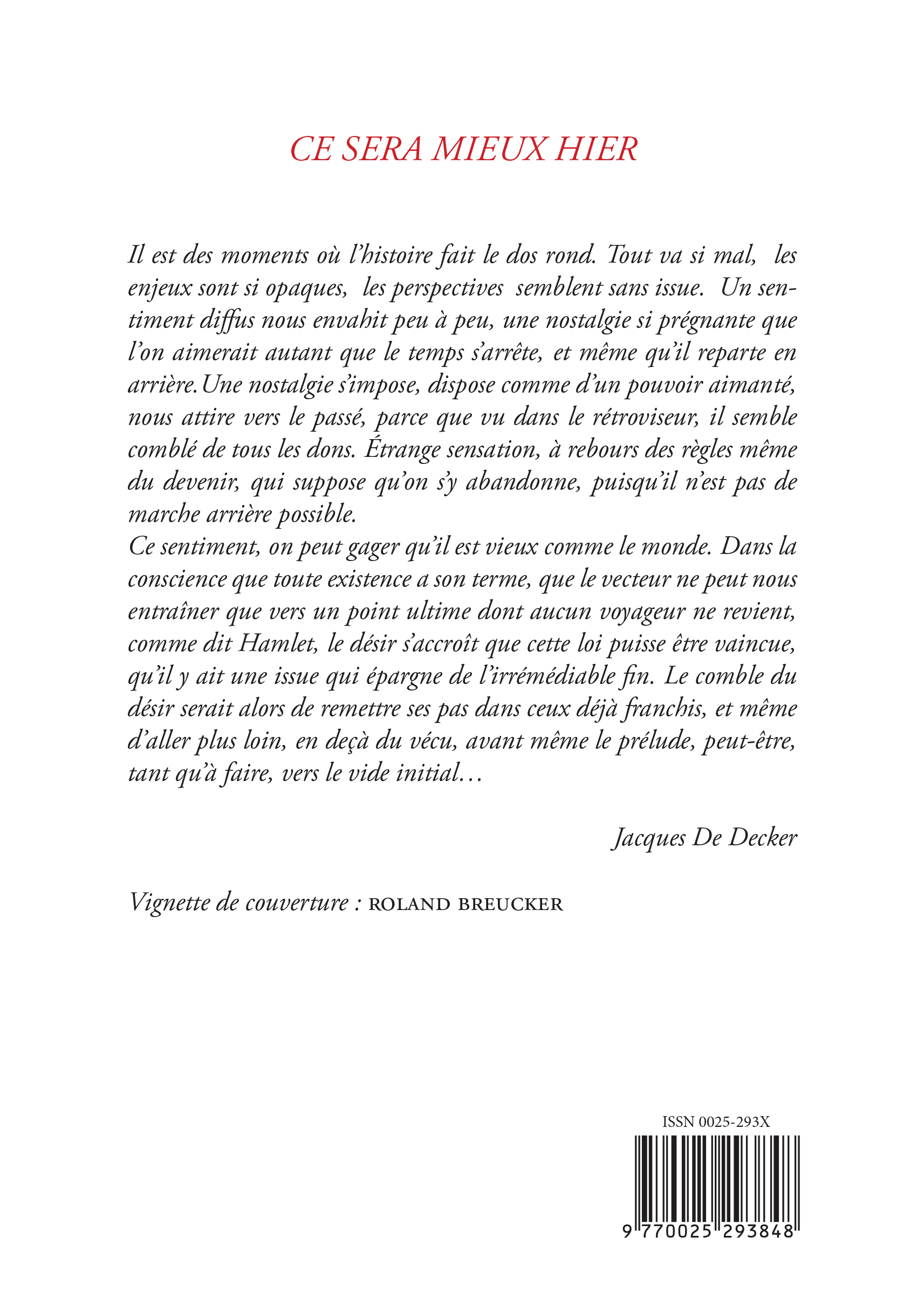 Il est des moments où l’histoire fait le dos rond. Tout va si mal, les enjeux sont si opaques, les perspectives semblent sans issue. Un sentiment diffus nous envahit peu à peu, une nostalgie si prégnante que l’on aimerait autant que le temps s’arrête, et même qu’il reparte en arrière.Une nostalgie s’impose, dispose comme d’un pouvoir aimanté, nous attire vers le passé, parce que vu dans le rétroviseur, il semble comblé de tous les dons. Étrange sensation, à rebours des règles même du devenir, qui suppose qu’on s’y abandonne, puisqu’il n’est pas de marche arrière possible.